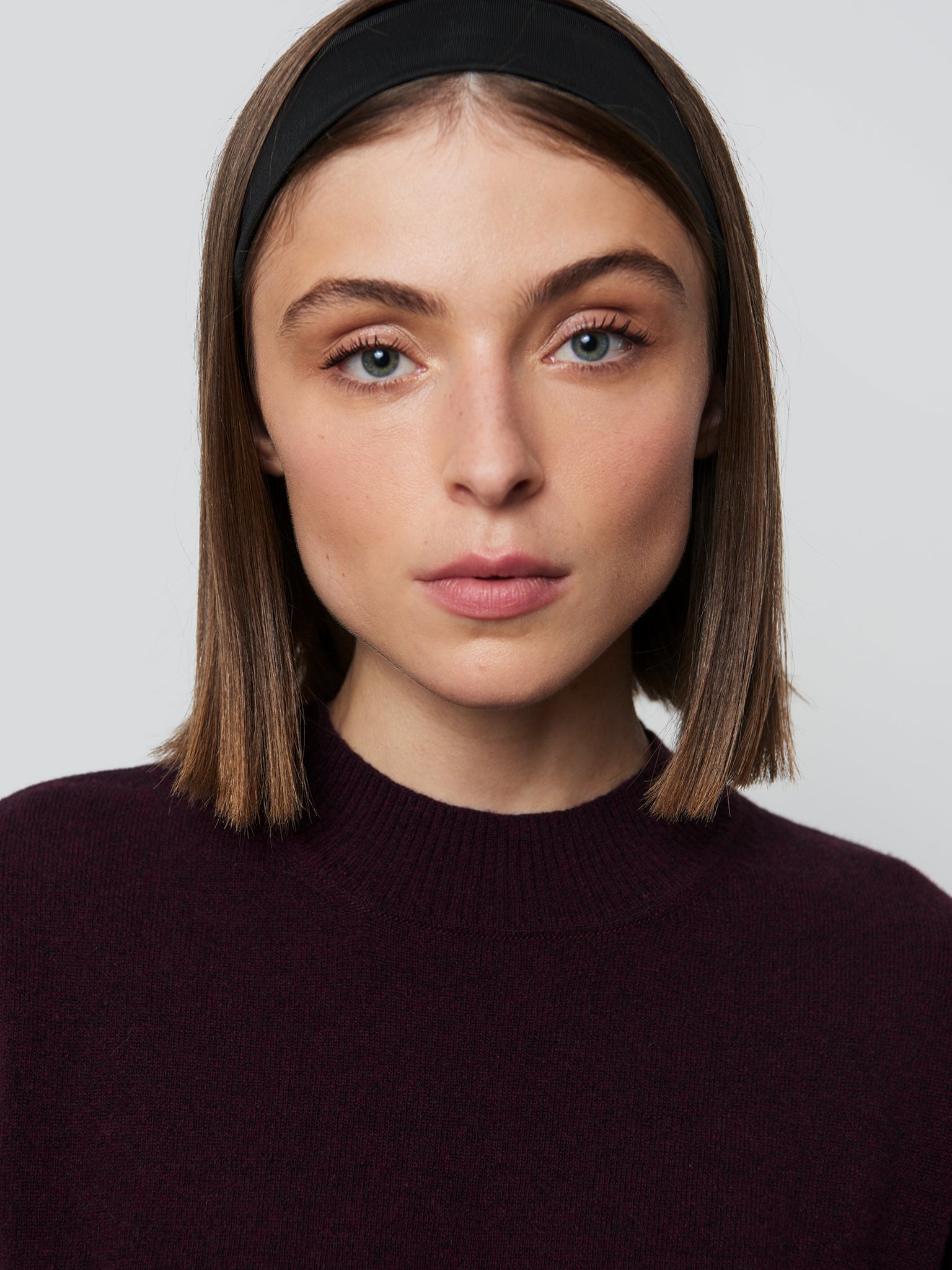 Le pull EIRA à manches 3/4 tombe juste au-dessus du coude et présente un col cheminé.